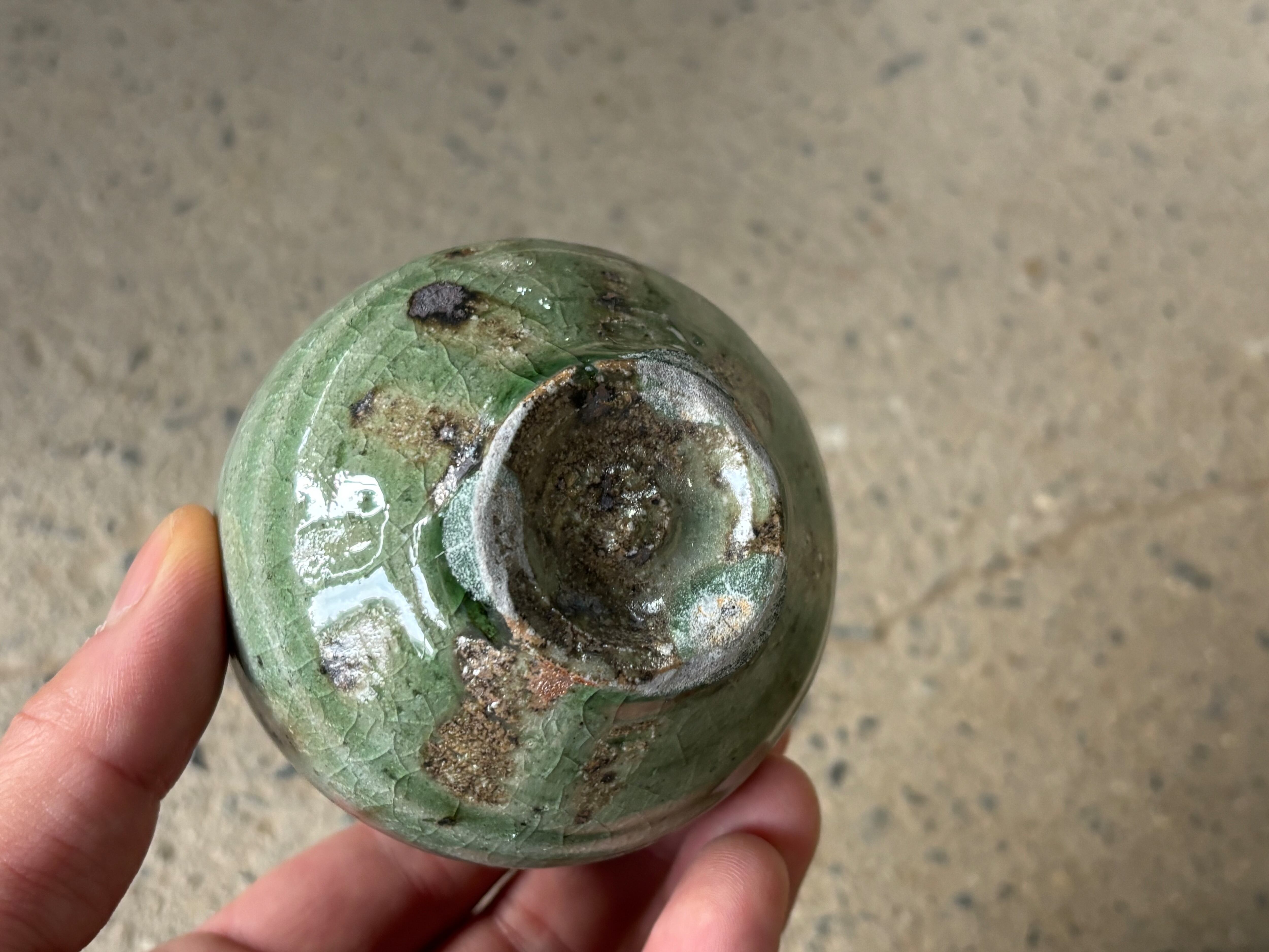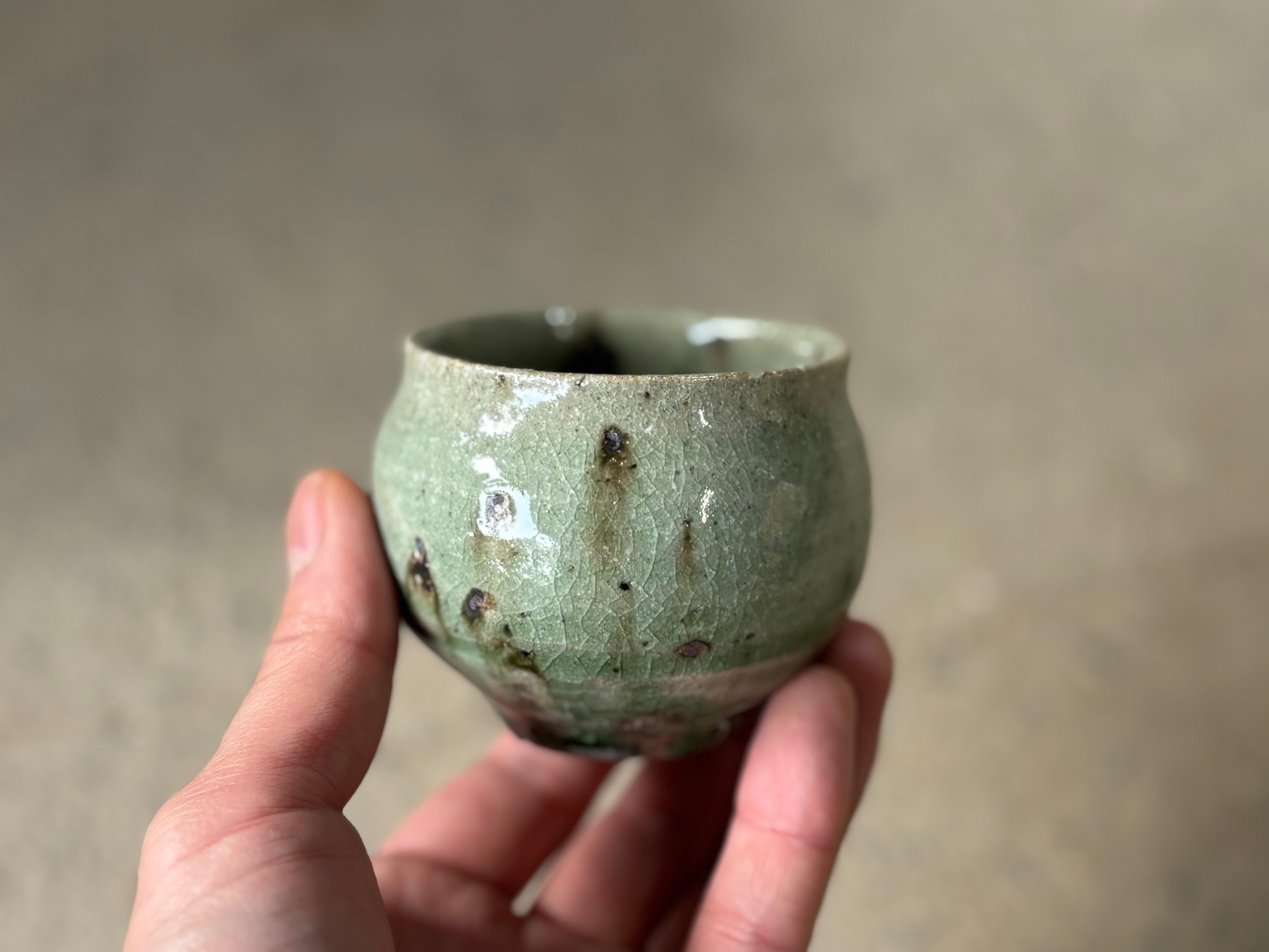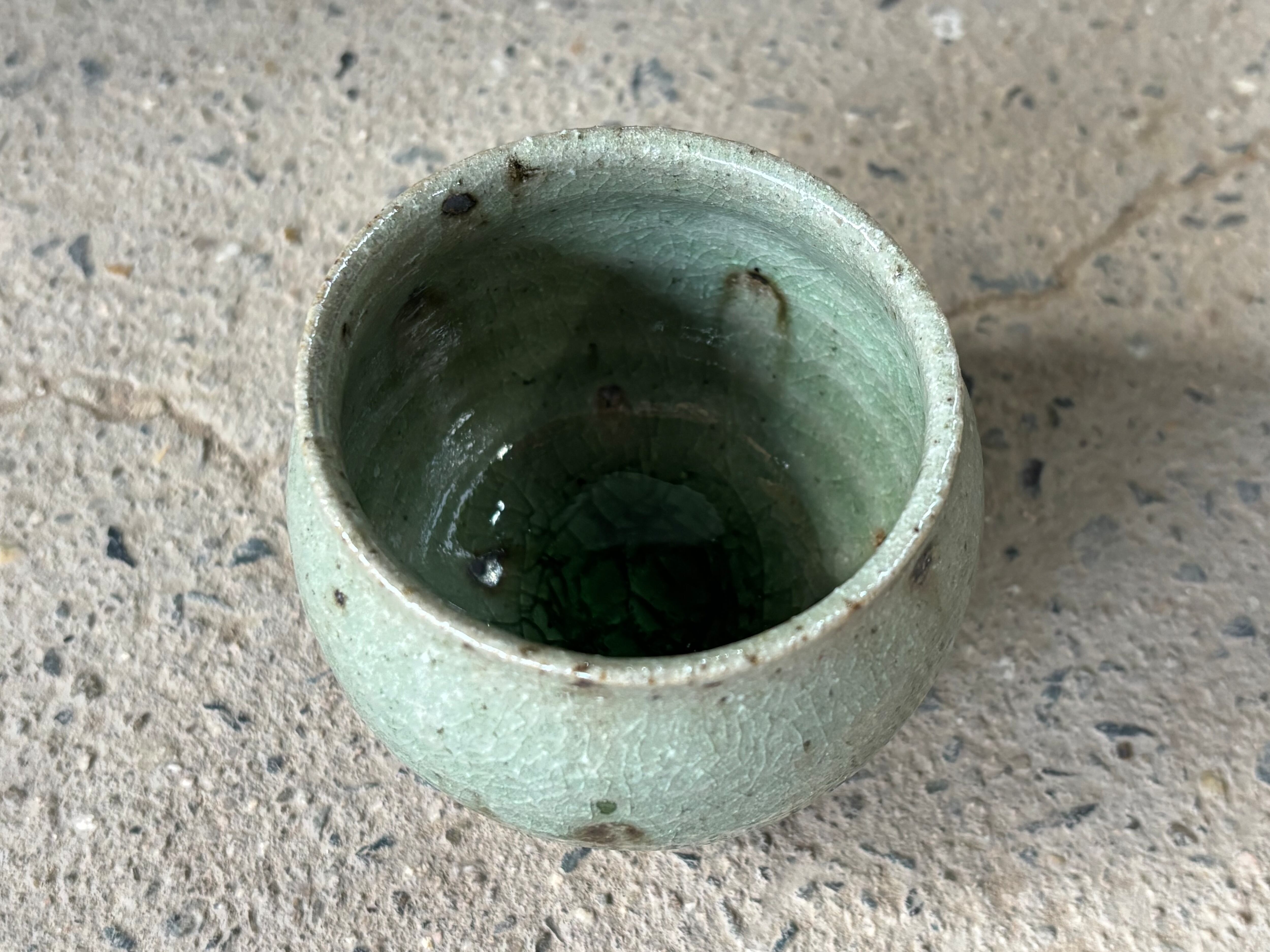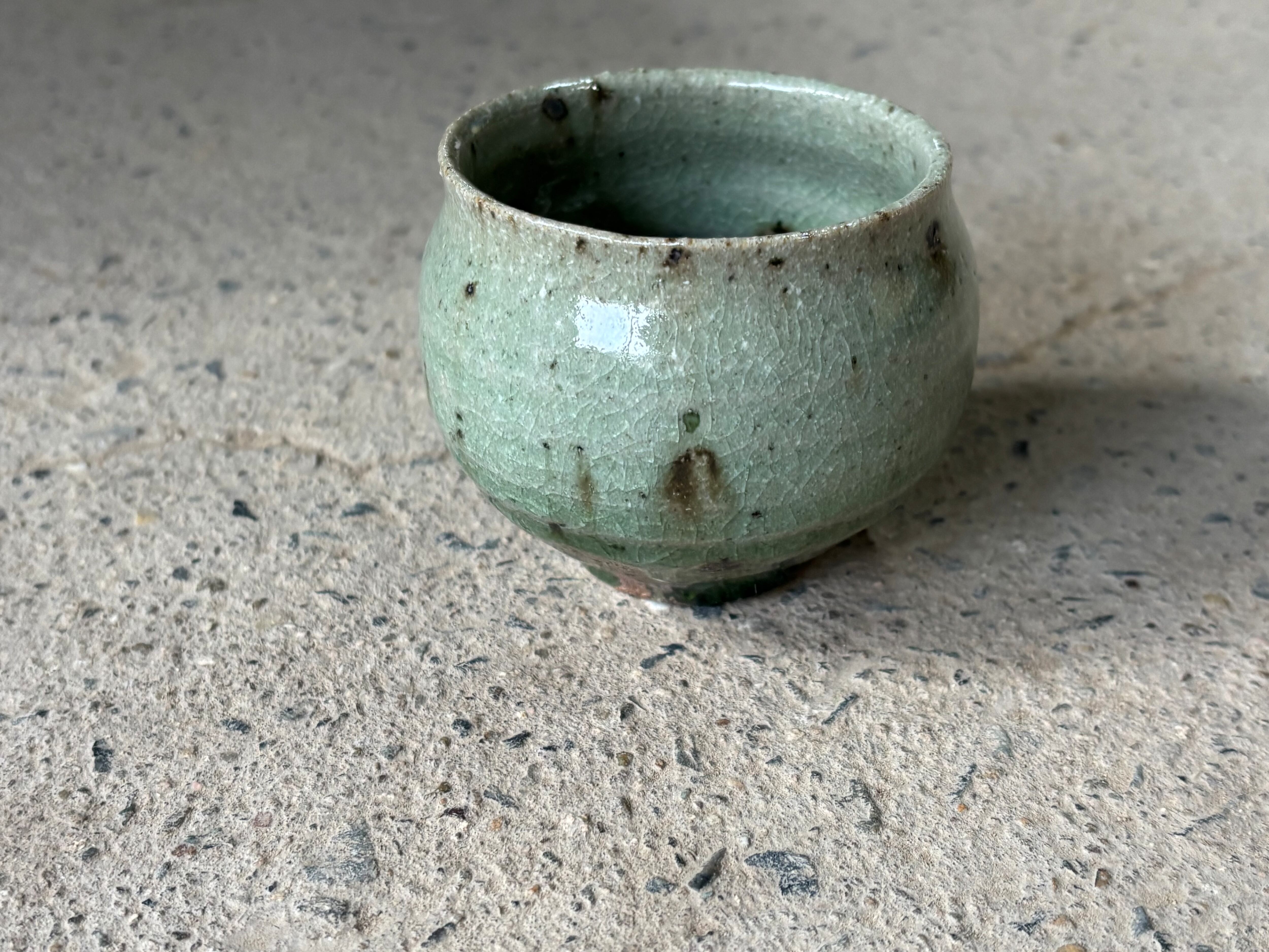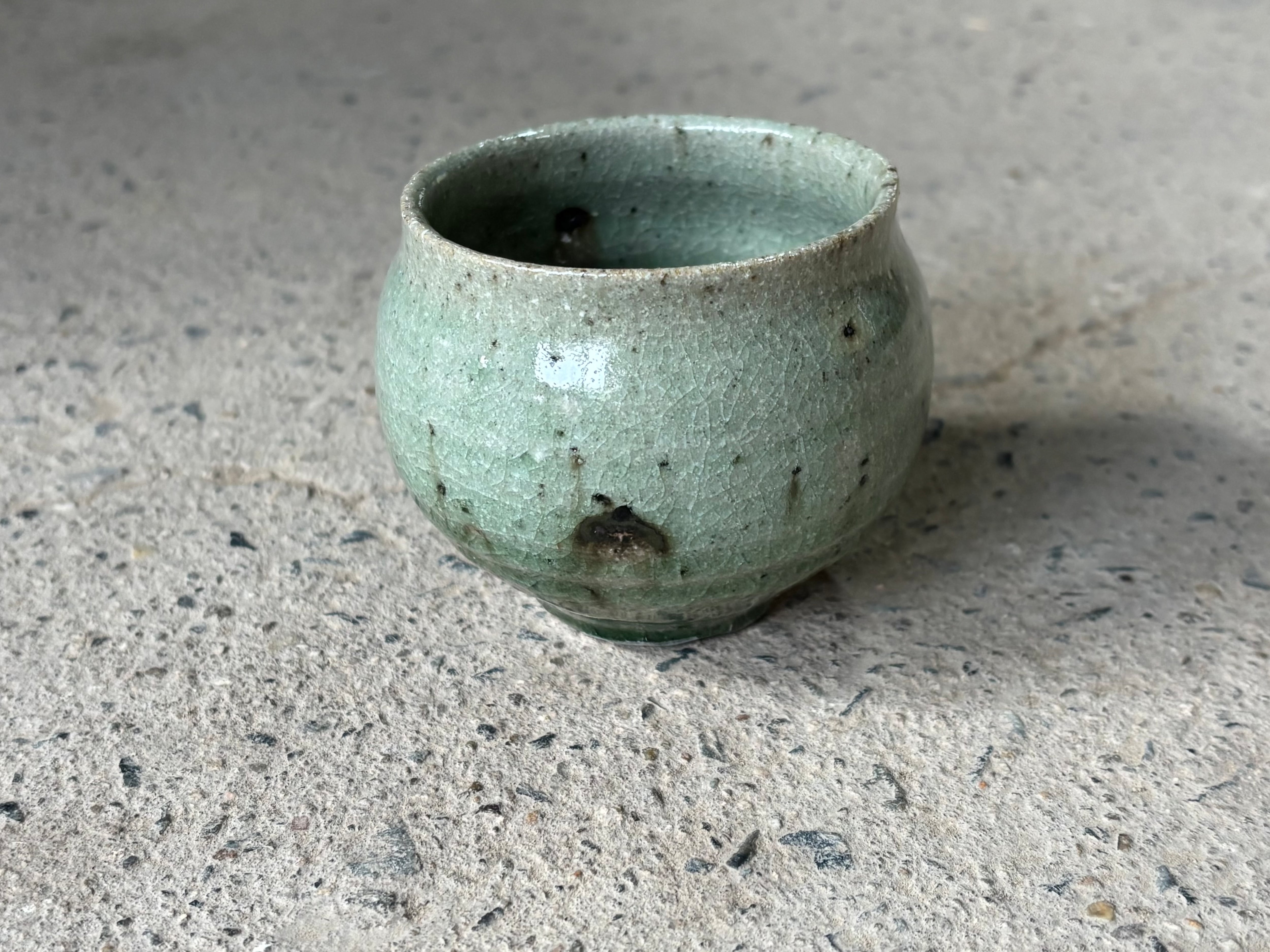 鉄粉の吹き出した雑味のある土に綺麗な灰釉をかけた風合いが特徴的なぐい呑みです。