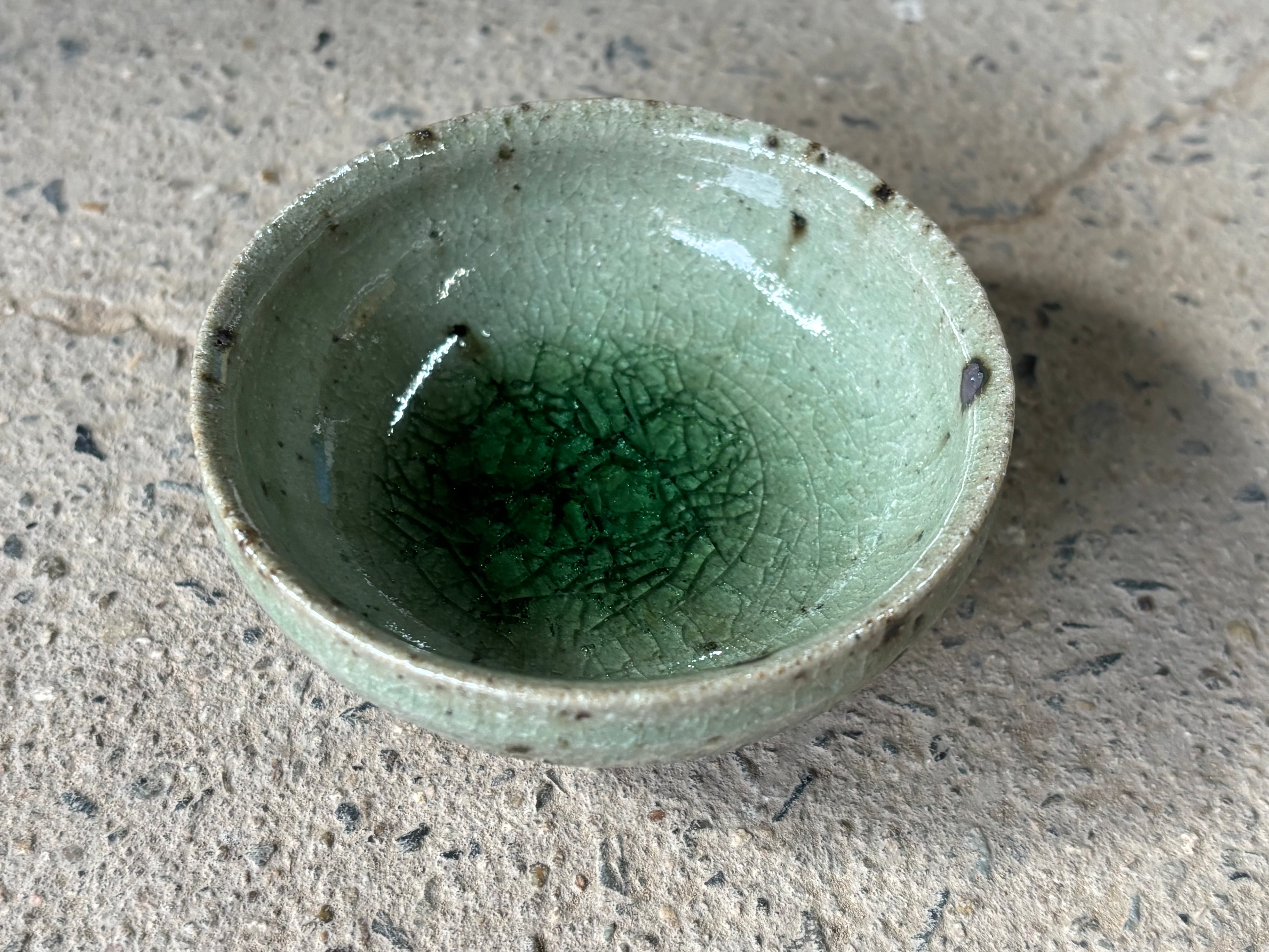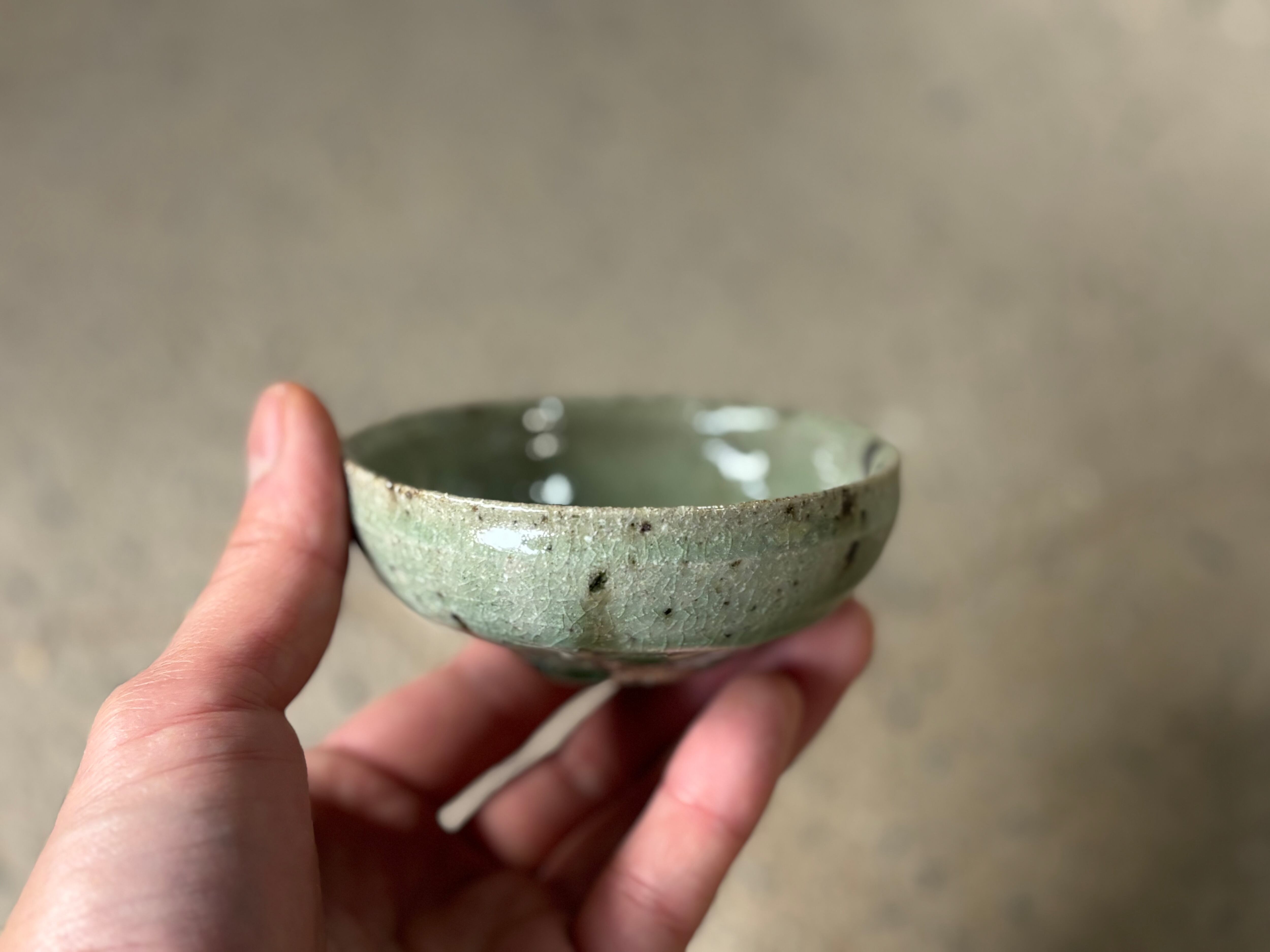鉄粉の吹き出した雑味のある土に綺麗な灰釉をかけた風合いが特徴的なぐい呑みです。